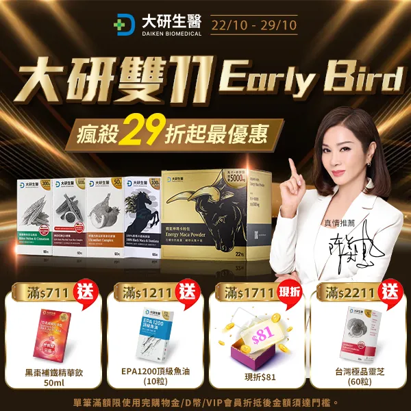 現凡推介好友註冊成為大研生醫(香港)會員,即可齊齊贈HKD128購物金;會員首次落單即贈EPA80%快樂魚油隨身包。單一消費滿HKD 750或以上即享免運費; 消費未滿HKD 750則只需額外支付HKD 70運費。立即購買我們的保健產品。