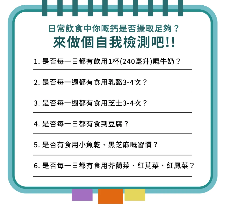 如果以上勾選唔到5個以上,你每日嘅鈣攝取係唔足夠嘅喔!